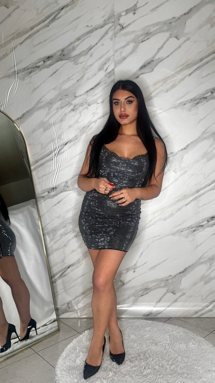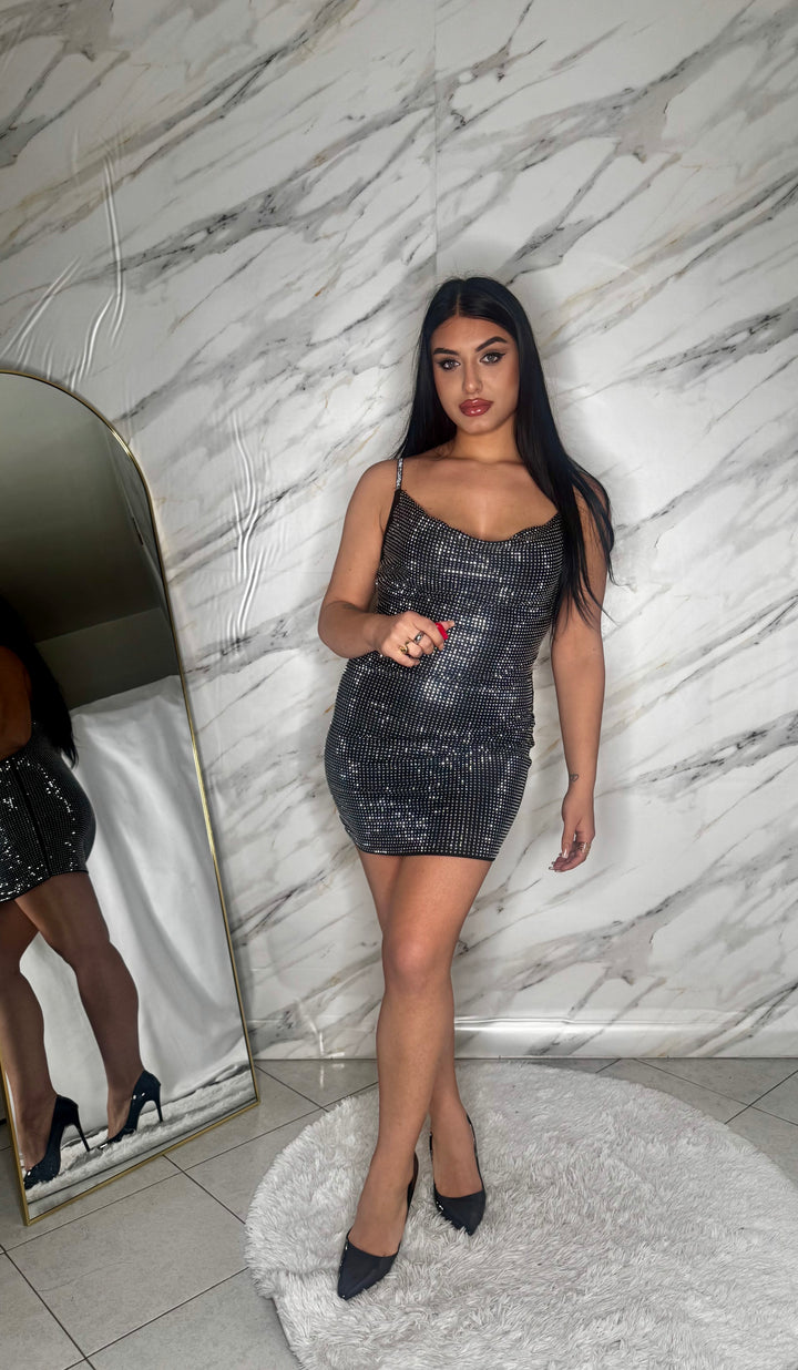 Un mini dress che non passa inosservato: interamente brillantinato, con spalline sottili e una vestibilità super aderente che valorizza ogni curva. Il tessuto è elasticizzato e confortevole, pensato per adattarsi perfettamente dalla XS fino alla L senza segnare. Luminoso, sensuale e ideale per party, feste ed eventi serali dove vuoi brillare più di tutti.