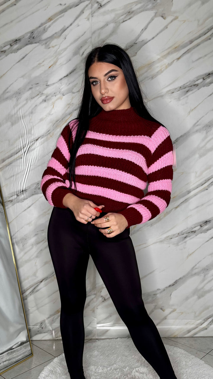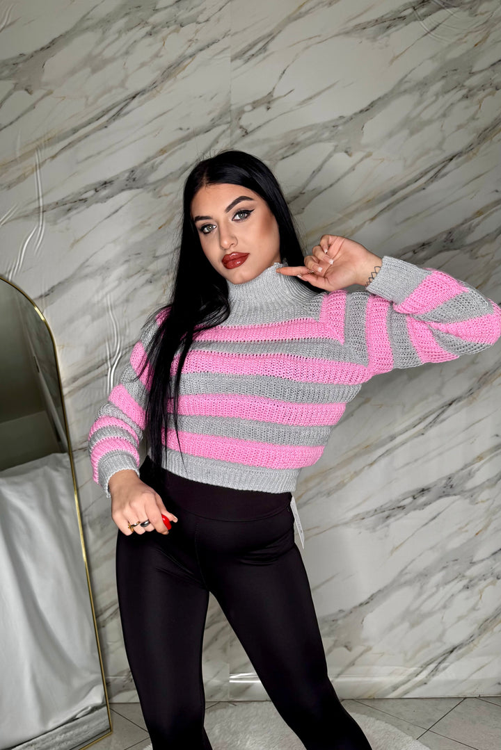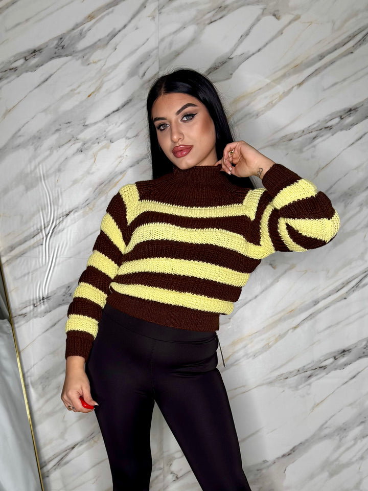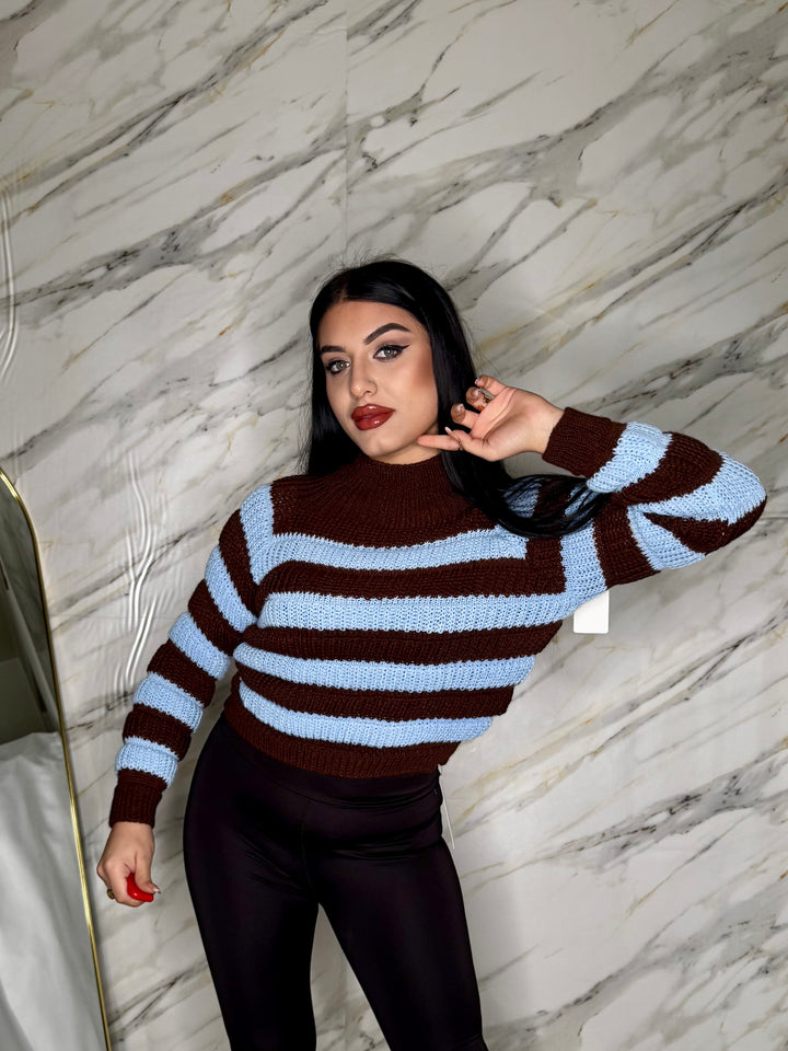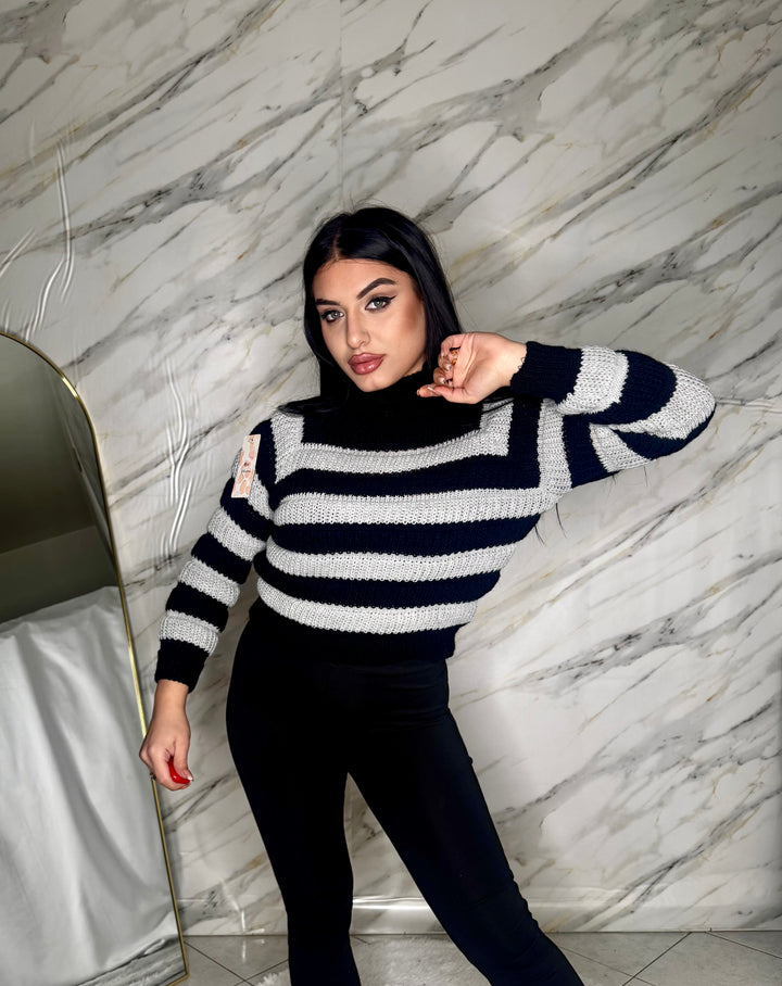 Maglioncino crop a righe, morbido e super trendy, perfetto da abbinare a jeans o pantaloni a vita alta. La vestibilità aderente valorizza la figura, mentre il taglio corto dona un tocco moderno e femminile. Comodo, versatile e ideale per ogni look casual-chic.