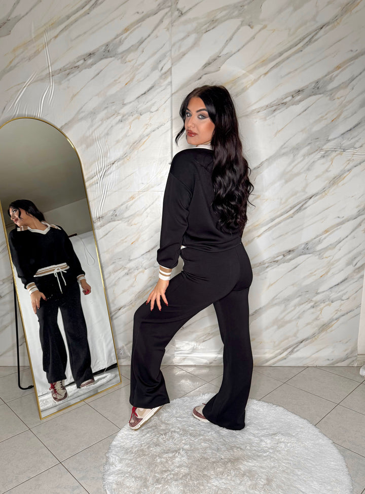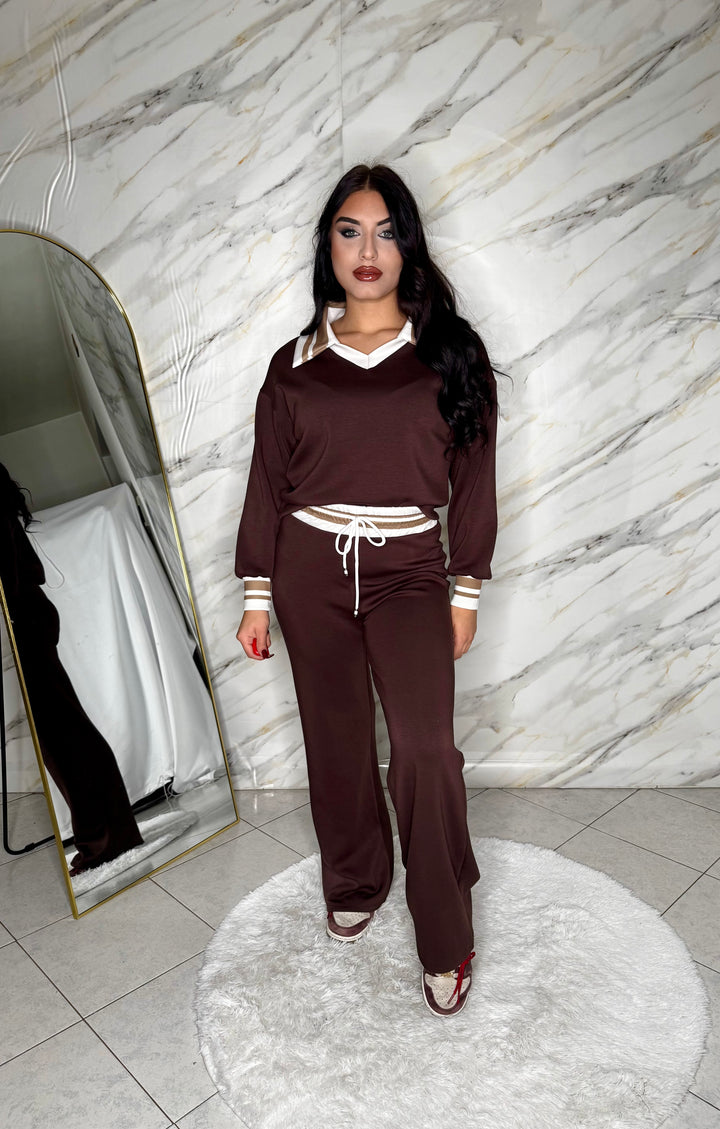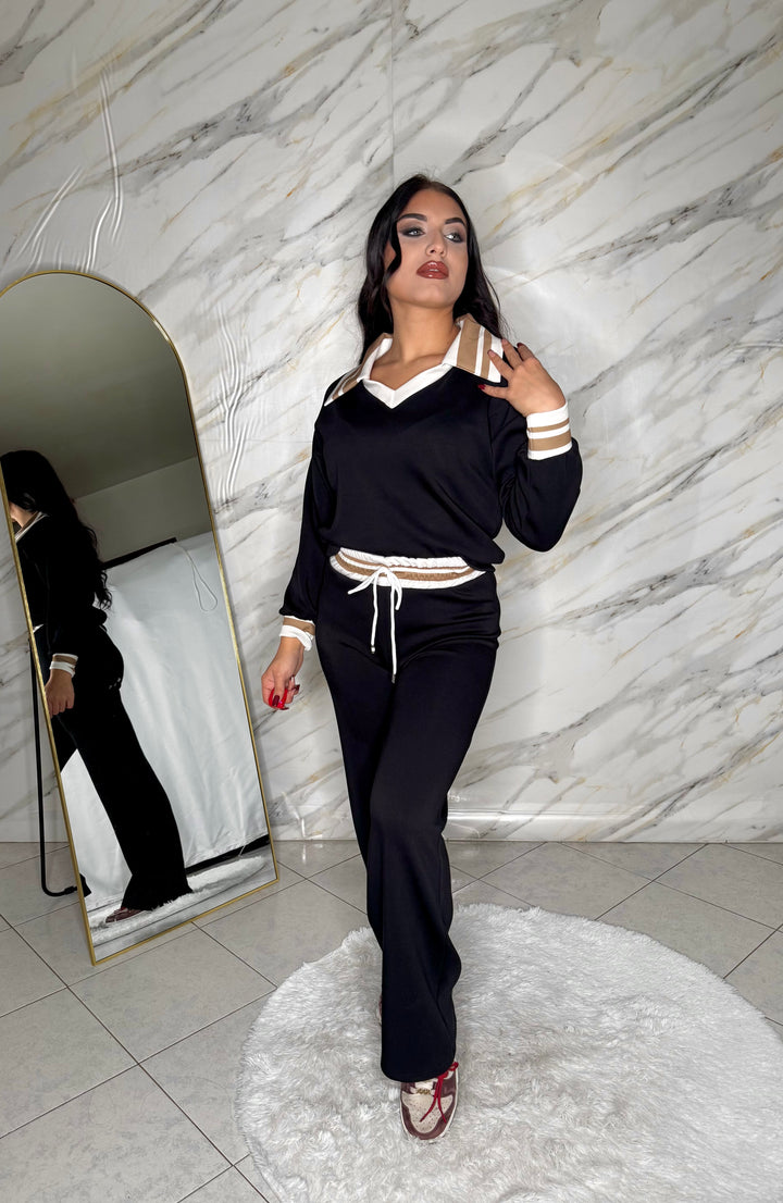 Tuta crazy dallo stile sporty-chic, composta da maglia con scollo a V e pantalone a gamba morbida.