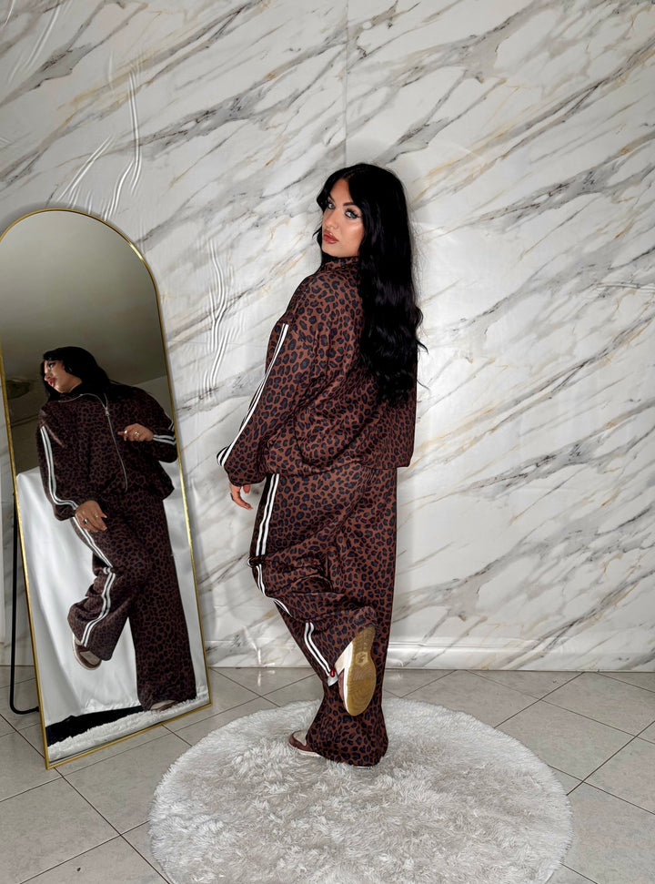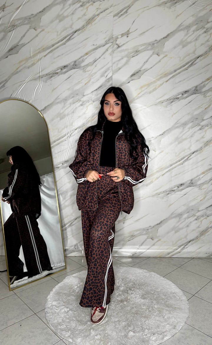 Giacca over e pantalone wide leg con banda laterale, stampa maculata e stile sporty-chic che non passa inosservato. Comodo, trendy e perfetto per dare carattere a qualsiasi outfit.